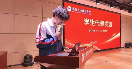上半场会议在热烈的氛围中结束,下半场活动聚焦学生成长展示与激励。首先,24护理(1)班学生代表姚棋文上台发言,他结合自身学习经历,分享了在学院的成长收获与感悟,感谢老师的谆谆教诲和家长的默默支持,同时表达了将以更饱满的热情投入学习,努力成为新时代技能人才的决心,话语间满是青春的朝气与担当。